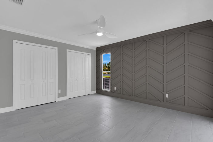 In this Fort Myers condo, a complete renovation was carried out to bring modern sophistication and practicality to every corner. The entire space was meticulously revamped, featuring new crown molding, doors, and custom carpentry details that added a sleek contemporary touch. In the bedrooms, eye-catching leaf-pattern carpentry added a unique visual appeal, showcasing expert craftsmanship.