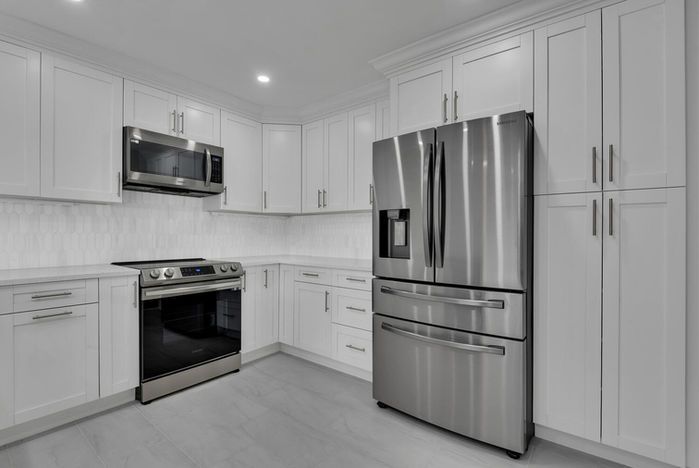 In the kitchen, a chic two-tone design was implemented with white and dark charcoal cabinetry. An oversized peninsula with a stone countertop not only adds style but also provides a practical seating area. A detailed marble tile backsplash enhances the kitchen's aesthetic appeal. Throughout the condo, well-placed LED lighting illuminates the space, emphasizing its modern features. Smart pantry systems were integrated into the bathrooms, maximizing storage options.