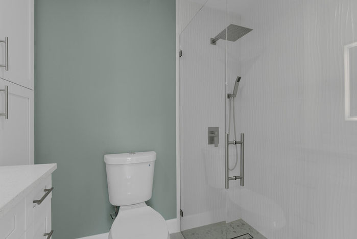 The renovation focused on improving convenience and functionality for the homeowners. A cleverly designed laundry closet now houses a stackable washer and dryer, optimizing space. Both bathrooms received stylish upgrades, including new shower tiles, modern tubs, sinks, and faucets, complemented by elegant vanities. Thoughtfully chosen paint colors and water ribbon tiles in the showers create a calming spa-like atmosphere.