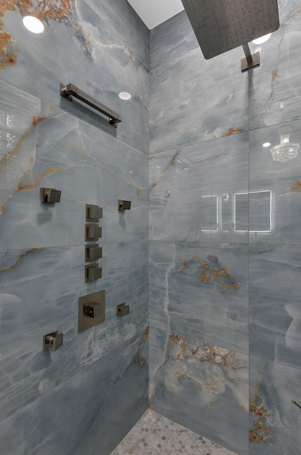 A marble hexagon flooring was added to this wet room for distinction and functionality. Hexagonal windows were closed to allow for more space and functionality of the 24 x 48 tiles running up the wet room walls. Vessel sinks and vessel faucets were added to the stunning quartz countertop, complementing the textured white subway tiles on the accent wall with LED mirror lighting.