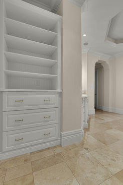 Inside, the chef's kitchen elevates everyday living with custom floor-to-ceiling cabinetry, reeded glass upper cabinets with interior lighting, Taj Mahal Supreme White quartz countertops and backsplash, ornate door profiles, custom-stained island with premium organizational inserts, and a redesigned butler's pantry featuring natural stacked stone and floating shelves.